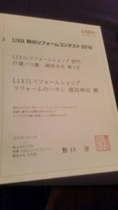 LIXILリフォームショップ部門 関西エリアにて、お風呂部門(戸建て)で第一位を獲得いたしました。